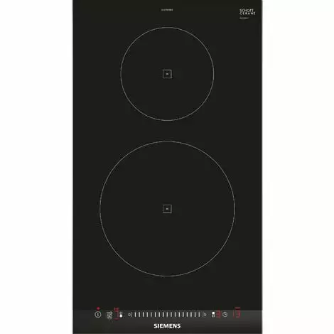 Table de cuisson Siemens EH375FBB1E.Ce Domino radiant rend la cuisine et le nettoyage plus facile.D’une largeur de 30 cm, il se combine très bien avec d’autres dominos.Fonction timer : la zone de cuisson se coupe une fois que le temps sélectionné arrive à échéance.Affichage digitalBandeau touchSlider.2 foyers inductionZones de cuisson : 1 x 145 mm, 1.4 kW (PowerBoost 2.2 kW), 1 x 210 mm, 2.2 kW (PowerBoost 3.7 kW).Fonction QuickStart : détection automatique des récipients sur la zone de cuissonFonction Re-Start : en cas d’arrêt brutal de la table, mémorisation de la température initiale pendant 4 secondesAffichage de la consommation énergétique17 positions de réglageTimer sur chaque foyerTémoin de chaleur résiduelle à 2 niveauxTouche nettoyage : possibilité de bloquer le bandeau de commande pendant 20 secondes afin de nettoyer la table en cas de débordement.