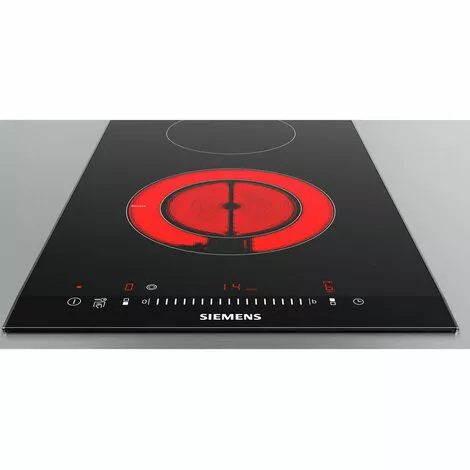 Table de cuisson SIEMENS ET375FFP1E.Le domino vitrocéramique pour cuisiner en toute sérénité et nettoyer en toute simplicité.Le domino de 30 cm de large est idéal pour personnaliser son plan de travail en l’associant à un autre domino ou une table classique avec profil inox sur les côtés.Grâce au touchSlider, la température peut être activée et contrôlée directement d’une simple pression ou d’un glissement du doigt.Grâce à la minuterie avec coupure automatique, la zone de cuisson se coupe automatiquement lorsque le temps de cuisson est écoulé.Design :Affichage digitalCommande touchSliderPuissance :2 zones highSpeed dont 1 foyer halogèneAvant 120 mm, 180 mm : 1 kW, 2 kWArrière 145 mm : Foyer normal 1.2 kW.Confort/Sécurité :Fonction Re-Start : en cas d’arrêt brutal de la table, mémorisation de la température initiale pendant 4 secondesAffichage de la consommation énergétique17 positions de réglageFonction powerBoostTimer sur chaque foyerTémoin de chaleur résiduelle à 2 niveauxTouche nettoyage : possibilité de bloquer le bandeau de commande pendant 20 secondes afin de nettoyer la table en cas de débordement