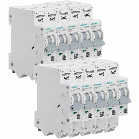 Description produit : SIEMENS 10 disjoncteurs 16A auto Ph+N Courbe C 4.5kA 230V. Pour protéger vos biens en cas de surchauffe ou de court-circuit. Recommandé, dans le cadre d’une utilisation résidentielle, pour la protection des circuits de prises , de radiateurs électriques (max 3680W), de volets-roulants ou d’éclairages. Disjoncteurs SIEMENS certifiés NF et CE, et la fiabilité et la durabilité sont garantis par le sérieux de la marque SIEMENS dans le choix de ses composants et son process qualité reconnu.Les bornes auto permettent un branchement simplifié, tout en étant rapide et sécurisé. Nombre de pôles : Monophasé 1 pôle + N ; Type de tension : AC ; Emprise dans le tableau : 1 module ; Raccordement par câble rigide 1,5 ou 2,5mm² ; Indice de protection : IP20 Caractéristiques techniques: Nombre de pôles protégés : 1