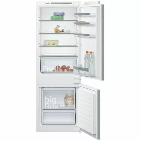 Réfrigérateur combiné intégrable iQ300 Siemens KI77VVSF0 avec compartiment pour conserver les fruits et légumes frais plus longtemps grâce à la freshBox avec fond ondulé.varioZone : L’aménagement intérieur des congélateurs offre une meilleure utilisation de l’espace pour plus de rangements utiles. Ils sont équipés de clayettes en verre et de tiroirs complètement amovibles, permettant ainsi de stocker des produits plus larges ou particulièrement hauts (type baguette entière) pour offrir toujours plus de modularité.Clayettes safetyGlass : Toutes les clayettes en verre de l’appareil sont en verre Securit, extrêmement solide et très facile à nettoyer. Quand un récipient se renverse, la clayette retient le liquide, évitant ainsi qu’il se déverse dans les autres compartiments du réfrigérateurlowFrost :Un appareil tapissé de givre et de glace consomme plus d’énergie : grâce à la technologie lowFrost l’évaporateur étant directement moulé dans la cuve, l’accumulation de glace est moindre. Non seulement la formation de glace est sensiblement plus faible et plus homogène, mais le dégivrage lui-même est beaucoup plus rapide que sur les appareils traditionnels.