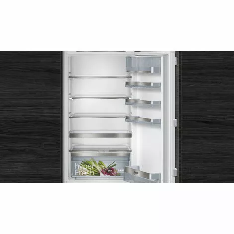 Réfrigérateur combiné intégrable à pantographe iQ500 Siemens KI86SADE0, avec technologie lowFrost et hyperFresh plus pour garder les aliments frais jusqu’à 2 fois plus longtemps. Compartiment hyperFresh plus avec régulation d’humidité : conserve fruits et légumes frais 2x plus longtemps. Technologie lowFrost : dégivrage plus rapide. Clayettes easyAccess : chargement et un déchargement facile. Les aliments, même placés au fond, restent facilement accessibles. La touche Super-Réfrigération abaisse la température pendant une période définie afin de rafraîchir rapidement les aliments que vous rangez dans votre réfrigérateur. Avec la varioZone tous les tiroirs et les clayettes du congélateur sont complètement amovibles permettant ainsi de stocker des produits de toutes tailles. Flexibilité totale et rangement optimisé.