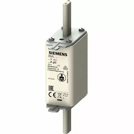 Fusible NH, NH1, in: 125 A, GG, un AC: 500 V, un DC: 440 V, détecteur de front, languettes de poignée sous tension système de sécurité NH 3NA, 3ND pour la protection sélective des câbles et des installations. Le système de sécurité NH de Siemens, qui est un élément important des composants de protection SENTRON pour l’installation électrique, offre une protection efficace des personnes, des appareils et des installations en cas de surcharge et de court-circuit. Par rapport aux disjoncteurs, des courants de court-circuit plus élevés peuvent être réalisés en même temps que de meilleures limitations de courant. Le système de sécurité NH se distingue principalement par : 1. Les feux combinés signalent l’arrêt du fusible en changeant de couleur de rouge à blanc. 2. Plus de sécurité lors du changement grâce aux languettes de préhension isolées. 3. Sélectivité élevée à faible coût. 4. Fonctionnement à long terme et sûr grâce à la lame de contact argentée. 5. Fusibles de 2 A à 1250 A et de tailles 000, 00, 0, 1, 2, 3, 4 et 4a disponibles. Ce texte a été traduit par une machine.