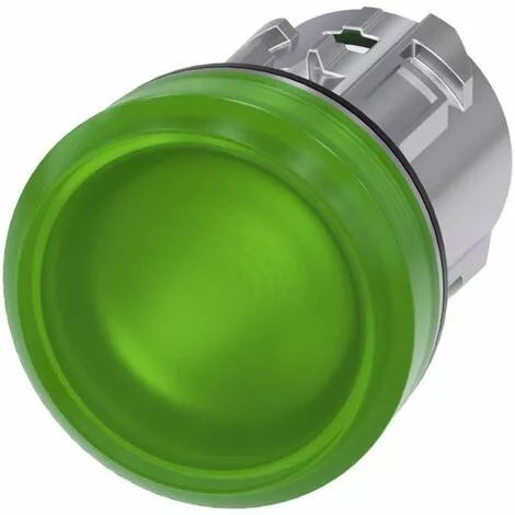 Indicator lights, 22 mm, round, metal, shiny, green, lens, smooth Indicator lights SIRIUS ACT for signaling switching states or faults in systems with high luminosity, thanks to energy-efficient LED technology. Under the brand name SIRIUS ACT, Siemens offers a unique portfolio of pushbuttons and signaling devices with global product approvals in four modern design lines of rugged genuine metal and high-grade plastic. An innovative snap-on concept makes the task of installing a unit so easy that it can be done with one hand and without any special tools. Groove-free holes are adequate as mounting holes since full twist prevention is already integrated. Thanks to the high degree of protection throughout, the rugged devices are suitable for use in industry and outdoors. Even cleaning with a high-pressure jet is possible. Neither dust, oils, nor caustic solutions can interfere with reliable operation. As well as standard wiring, the devices can also be connected to the controller via PROFINET, AS-Interface or IO-Link. Doing so will help you to reduce wiring time and effort, minimize error sources and have more flexibility. The graphical Online Configurator provides convenient support when selecting and ordering individual devices, enclosures and labels. Extensive documentation (e.g. manual, 3D data, terminal diagram) is available. Versions available: Several colors, different voltage variants. Note: Single device, please order holders and modules separately. SIRIUS ACT – Performance in action for control and signalling. Simply mounted, simply strong, simply perfect.