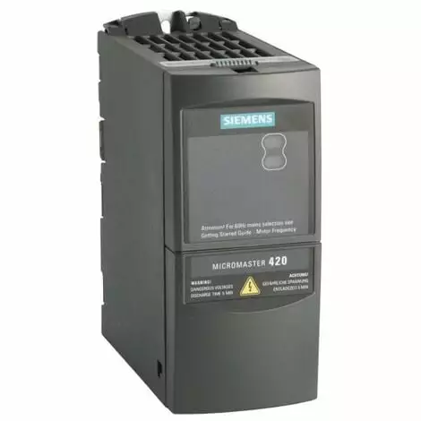 Micromaster 420, entrée monophasée de 230 V ou entrée triphasée de 440 V. Gamme de puissance 0,75 Kw. LxlxP: 73x173x149mm.