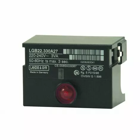 Coffrets de sécurité LGB22 230B27 pour la surveillance de brûleurs à gaz ou gaz/fioul à une ou deux allures, de faible à moyenne puissance (jusqu’à 350 kW), avec ou sans ventilateur, à fonctionnement intermittent. Pré-ventilation : 26 secondes Pré-allumage : 25 secondes Sécurité : 5 secondes Nombre allures : 2 LGB22.230B27
