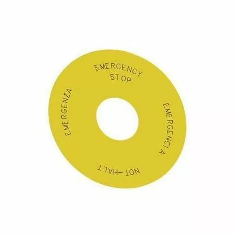 Etiquette ronde autocollante JAUNE, pour bouton champignon STOP/EMERGENCY, diamètre extérieur 75 mm, diamètre intérieur 23 mm, avec inscription URGENCE en 4 langues : DE, EN, IT, IT, SP