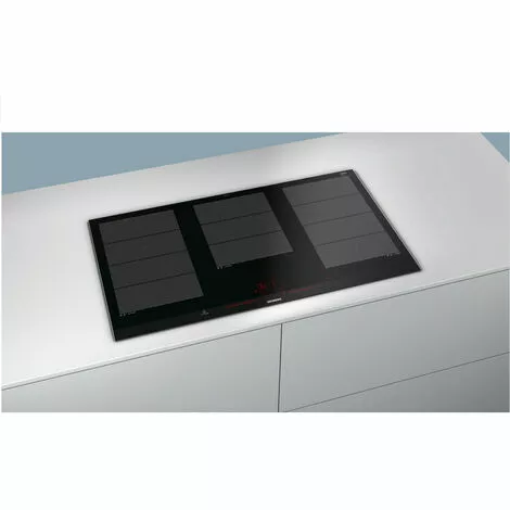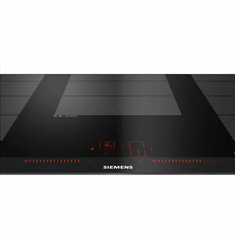 Table de cuisson SIEMENS EX975LXC1F.Table à induction avec de nouvelles fonctions innovantes, pour une grande flexibilité en toute situation.Bandeau dual lightSlider, pour un contrôle facile et intuitif de la table.PowerMove Plus permet un contrôle intuitif grâce à trois zones de cuisson avec des températures différentes.FryingSensor : maintient automatiquement la température désirée de la poêle. Aucun risque de brûler les aliments.Design :Affichage digitalCommande Dual LightSliderPuissance :5 foyers inductiondont 3 zones de cuisson flexInduction (zone libre équipée de 4 inducteurs ovales)Zones de cuisson : 1 x 380 mm x 240 mm, 3.3 kW (PowerBoost 3.7 kW) ou 2 x Ø 240 mm, 2.2 kW (PowerBoost 3.7 kW), 1 x 300 mm x 240 mm, 2.6 kW (PowerBoost 3.7 kW), 1 x 380 mm x 240 mm, 3.3 kW (PowerBoost 3.7 kW) ou 2 x Ø 240 mm, 2.2 kW (PowerBoost 3.7 kW)Confort/Sécurité :fryingSensor Plus : capteur de température pour les poêlesFonction QuickStart : détection automatique des récipients sur la zone de cuissonFonction Re-Start : en cas d’arrêt brutal de la table, mémorisation de la température initiale pendant 4 secondespowerMove Plus : 3 puissances prédéfiniesAffichage de la consommation énergétique17 positions de réglagePowerBoost sur chaque foyerPanBoost : booster spécial pour les poêlesTimer sur chaque foyerTémoin de chaleur résiduelle à 2 niveauxTouche nettoyage : possibilité de bloquer le bandeau de commande pendant 20 secondes afin de nettoyer la table en cas de débordement