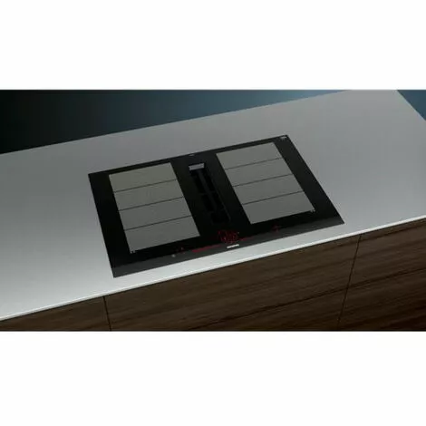 Table induction aspirante IQ700 Siemens EX875LX57E bénéficie de 2 zones FlexInduction Plus (40 x 24 cm 3,7 kW ou 2 zones 20 x 24 cm 3,7 kW). Fonction FlexMotion : reconnaissance des déplacements des récipients. Fonction FryingSensor Plus : après sélection des réglages, les capteurs situés dans la table mesurent la température de la poêle et, une fois celle-ci atteinte, un signal est émis pour disposer les aliments dans la poêle et la chaleur est maintenue pendant toute la cuisson. Fonction PowerMove Plus : permet un réglage de puissance facile et pratique grâce à des réglages pré-enregistrés et adaptés aux étapes de la cuisson. De la cuisson à haute température à l’avant jusqu’au maintien au chaud à l’arrière, chaque zone est activée en déplaçant l’ustensile de cuisson sur la zone flexible. Fonction PanBoost : booster spécifique pour les poêles, elle permet d’augmenter la puissance de cuisson pendant une durée de 30 secondes. PowerBoost sur chaque foyer. Minuterie coupe-circuit pour chaque foyer. Fonction QuickStart : détection automatique des récipients sur la zone de cuisson. Fonction ReStart : en cas d’arrêt brutal de la table, mémorisation de la température initiale pendant 4 secondes. Reconnaissance automatique des casseroles. Touche Nettoyage : possibilité de bloquer le bandeau de commande pendant 20 secondes afin de nettoyer la table en cas de débordement. Témoins de chaleur résiduelle à 2 niveaux. Fonction de gestion d’énergie : s’adapte facilement à toute installation électrique, quelle que soit la puissance du réseau électrique. Commandes sensitives Dual lightSlider : le bandeau de commande rétroéclairé dual lightSlider permet, très facilement, de sélectionner et de réunir les zones de cuisson grâce à une interface bien pensée et totalement invisible lorsque la table est éteinte. Système de ventilation intégré (622 m3/h / Energie B / Graisse B / Fluide A / 69 dB) : fonctionnement en mode évacuation ou en mode recyclage (accessoire en option selon le type d’installation). 17 vitesses dont 2 Intensives temporisées. Fonction climateControl : ajuste automatiquement la puissance en fonction des vapeurs et des odeurs. Fonctionnement automatique lors de l’utilisation d’une zone de cuisson. Témoin de saturation du filtre métallique et à charbon actif. Grille d’aération en fonte, résistante à la chaleur et lavable au lave-vaisselle. Filtre à graisse et collecteur de liquide amovibles et lavables au lave-vaisselle. Réservoir de sécurité d’une capacité de 700 ml pour liquide en débordement. Home Connect : contrôle à distance.Le + produit : Le capteur climateControl régule l’aspiration automatiquement selon la quantité de vapeur et l’intensité des odeurs.