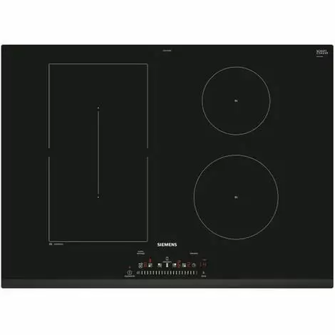 Table de cuisson induction iQ500 Siemens ED731FSB5F dotée de 4 foyers dont 1 CombiZone 2x Ø 19 cm 3,7 kW : plus de flexibilité en combinant deux zones de cuisson. Fonction PowerMove : 2 puissances prédéfinies. Fonction QuickStart : détection automatique des récipients sur la zone de cuisson. Fonction ReStart : en cas d’arrêt brutal de la table, mémorisation de la température initiale pendant 4 secondes. Reconnaissance automatique des casseroles. Touche Nettoyage : possibilité de bloquer le bandeau de commande pendant 20 secondes afin de nettoyer la table en cas de débordement. Fonction de gestion d’énergie : s’adapte facilement à toute installation électrique, quelle que soit la puissance du réseau électrique. Affichage de la consommation énergétique.