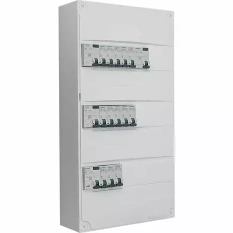 Description produit : Tableau électrique 3 rangées pré-équipé. Pour montage en GTL (gaine technique de logement) ou en saillie. Tableau électrique pré-équipé d’un interrupteur différentiel 30mA 40A type A + 3 interrupteurs différentiels 30mA 40A type AC + 5 disjoncteurs 10A + 4 disjoncteurs 16A + 3 disjoncteurs 20A + 1 disjoncteur 32A Indice de protection : IP30 Résistance aux chocs : IK05 Dimensions : hauteur : 475 mm Largeur : 250 mm Profondeur : 97 mm Composition du tableau pré-équipé 3 rangées SIEMENS :