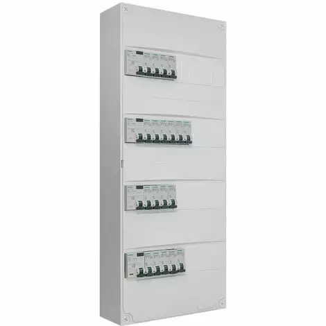 Description produit : Tableau électrique 4 rangées pré-équipé. Pour montage en GTL (gaine technique de logement) ou en saillie. Tableau électrique prééquipé d’un interrupteur différentiel 30mA 40A type A + 3 interrupteurs différentiels 30mA 63A type AC + 1 disjoncteur 2A + 3 disjoncteurs 10A + 7 disjoncteurs 16A + 7 disjoncteurs 20A + 1 disjoncteur 32A Indice de protection : IP30 Résistance aux chocs : IK05 Dimensions : hauteur : 600 mm Largeur : 250 mm Profondeur : 97 mm Composition du tableau pré-équipé 4 rangées SIEMENS :