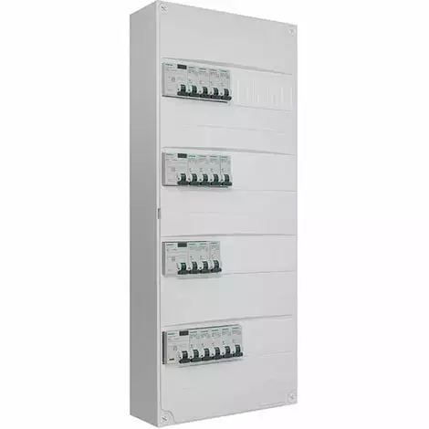 Description produit : Tableau électrique 4 rangées pré-équipé. Pour montage en GTL (gaine technique de logement) ou en saillie. Tableau électrique prééquipé d’un interrupteur différentiel 30mA 63A type A + 2 interrupteurs différentiels 30mA 40A type AC + 1 interrupteur différentiel 30mA 63A type AC + 4 disjoncteurs 10A + 6 disjoncteurs 16A + 5 disjoncteurs 20A + 1 disjoncteur 32A Indice de protection : IP30 Résistance aux chocs : IK05 Dimensions : hauteur : 600 mm Largeur : 250 mm Profondeur : 97 mm Composition du tableau pré-équipé 4 rangées SIEMENS :
