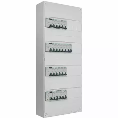 Description produit : Tableau électrique 4 rangées pré-équipé. Pour montage en GTL (gaine technique de logement) ou en saillie. Tableau électrique prééquipé d’un interrupteur différentiel 30mA 63A type A + 3 interrupteurs différentiels 30mA 63A type AC + 1 disjoncteur 2A + 4 disjoncteurs 10A + 8 disjoncteurs 16A + 8 disjoncteurs 20A + 1 disjoncteur 32A Indice de protection : IP30 Résistance aux chocs : IK05 Dimensions : hauteur : 600 mm Largeur : 250 mm Profondeur : 97 mm Composition du tableau pré-équipé 4 rangées SIEMENS :