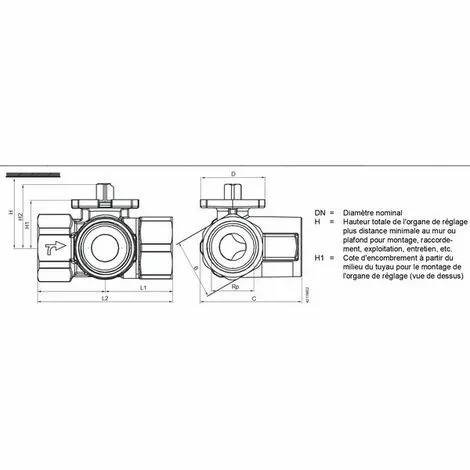 Vanne à boisseau sphérique PN40 3 voies DN32 kvs 16 raccords à filetage intérieur Rp.. selon iso 7-1. À utiliser dans les installations de chauffage, de ventilation et de climatisation comme commande. pour les circuits fermés 5…120°C